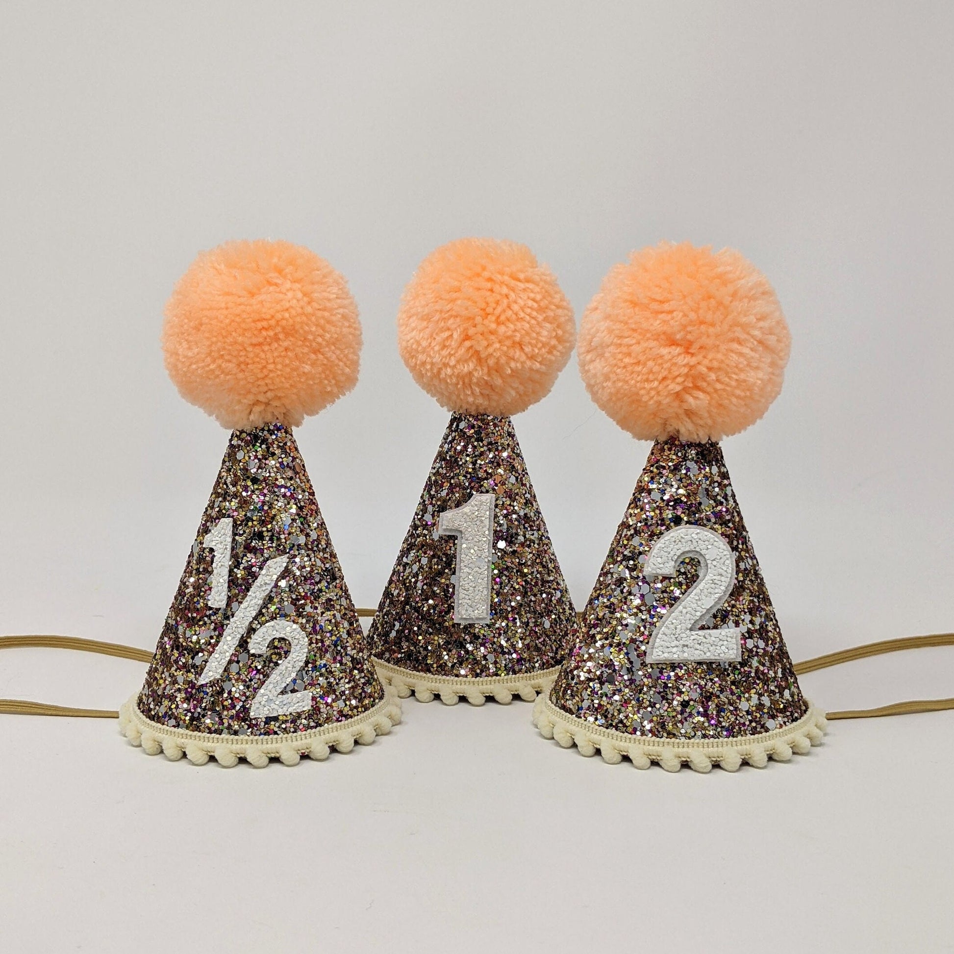 Large Confetti glitter hat, Peach pom pom, Cream pom trim, with or without WHITE Number backed in White.