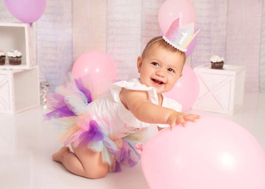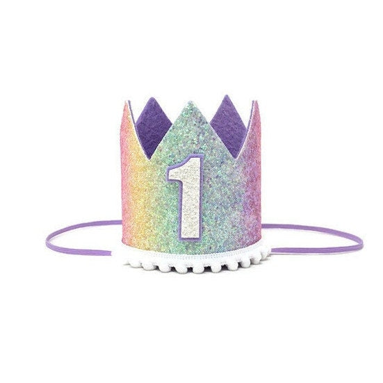 Pastel Rainbow Ombre glitter crown, White pom trim, with or without WHITE number backed in Lavender.