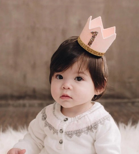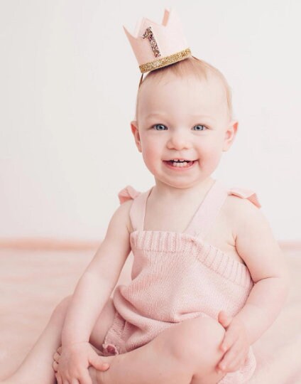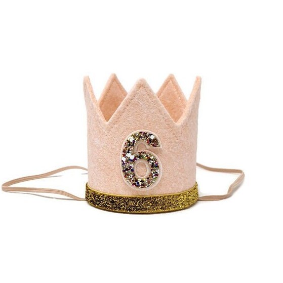Blush Felt crown, Gold Glitter trim, with or without Confetti Glitter number backed in White.