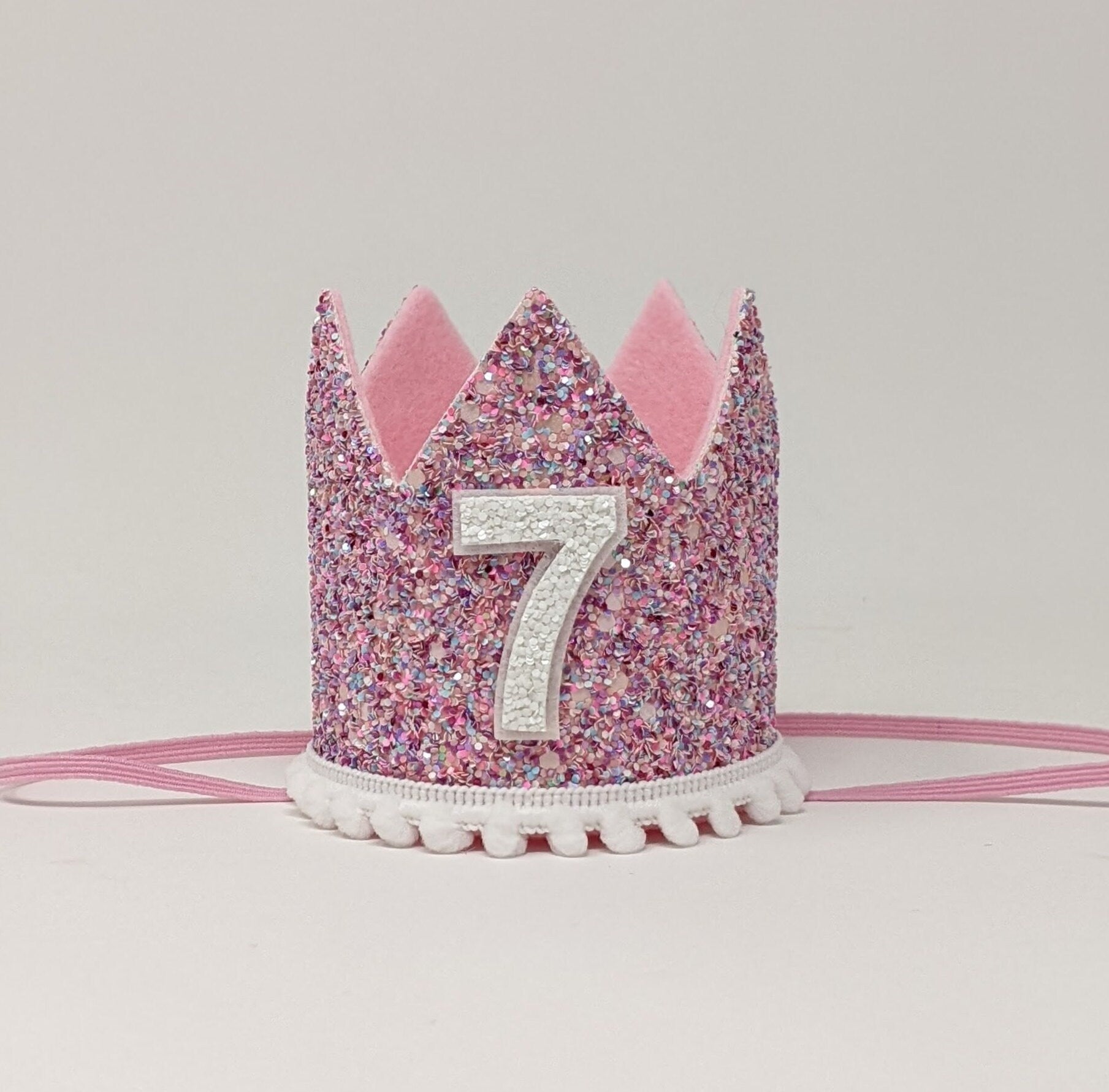 Colorful glitter crown in (Pinks and Fuchsia), White pom trim, with or without White number backed in White.