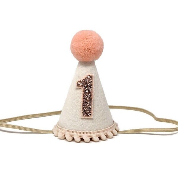 Small (Mini) or Large Linen Felt Hat, Blush yarn pom, Blush pom trim, with or without Rose Gold Glitter number backed in Pale Blush.