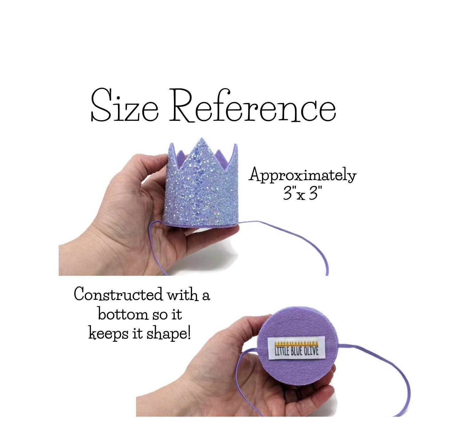 LITTLE BLUE OLIVE CROWNS and HATS are the perfect accessory for birthday celebrations, memorable photo shoots and every day fun for dress up. Hats are hand crafted of a high quality, non-shed glitter. Please reference picture for size.